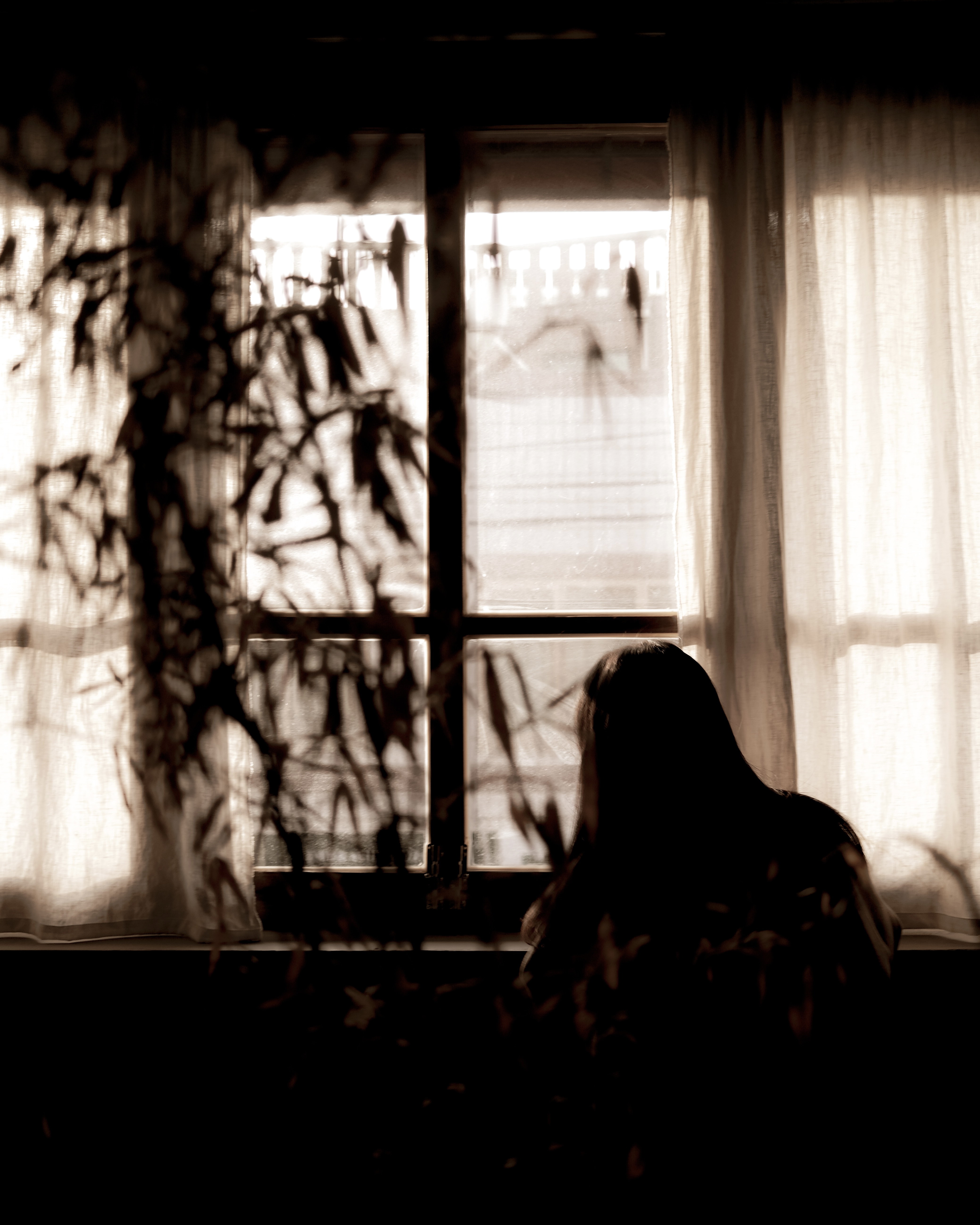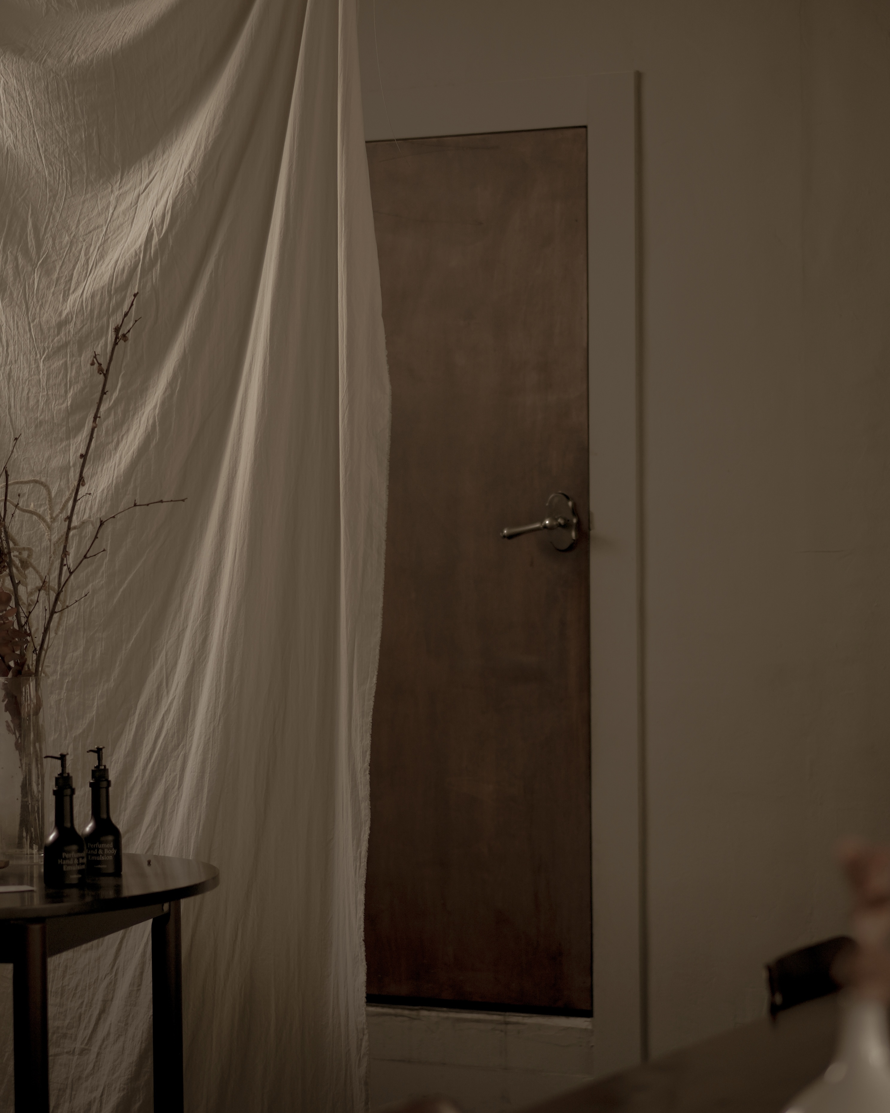 까만 나무색의 가구들과 광목천, 햇볕이 드리우는 창가