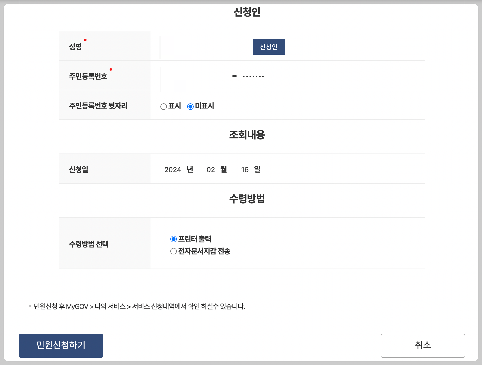 - 수령방법(프린터 출력 또는 전자문서지갑 전송)을 선택