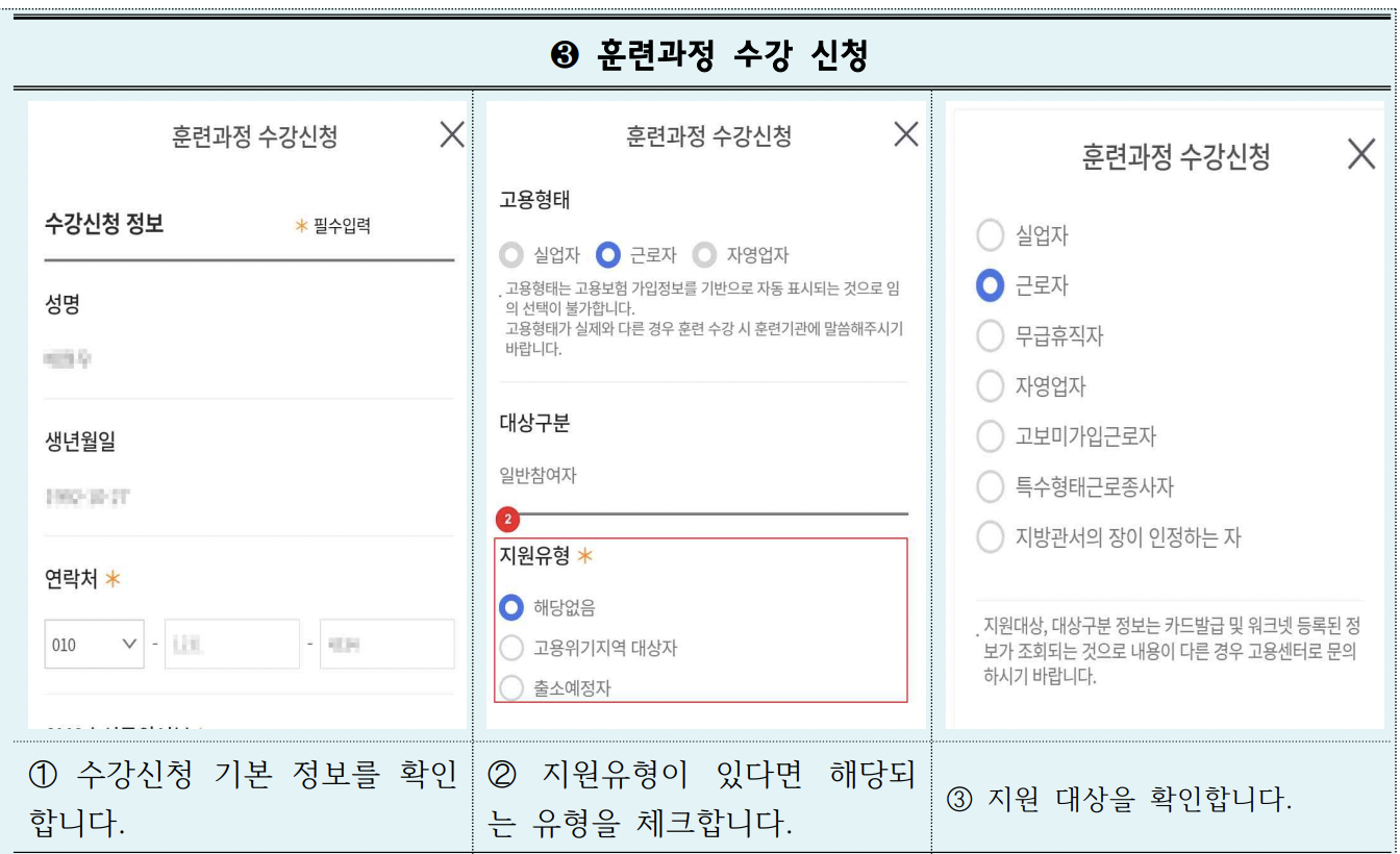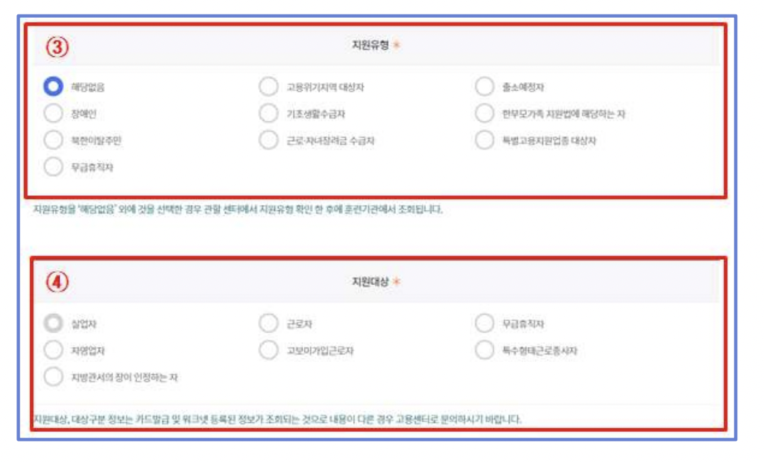 - ‘해당없음’외 지원 유형을 선택하는 경우, 고용센터 확인 후 훈련기관에서 신청정보를 확인할 수 있습니다.