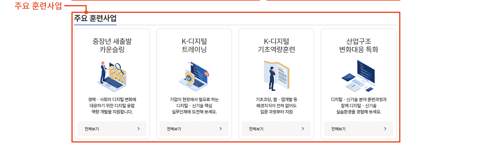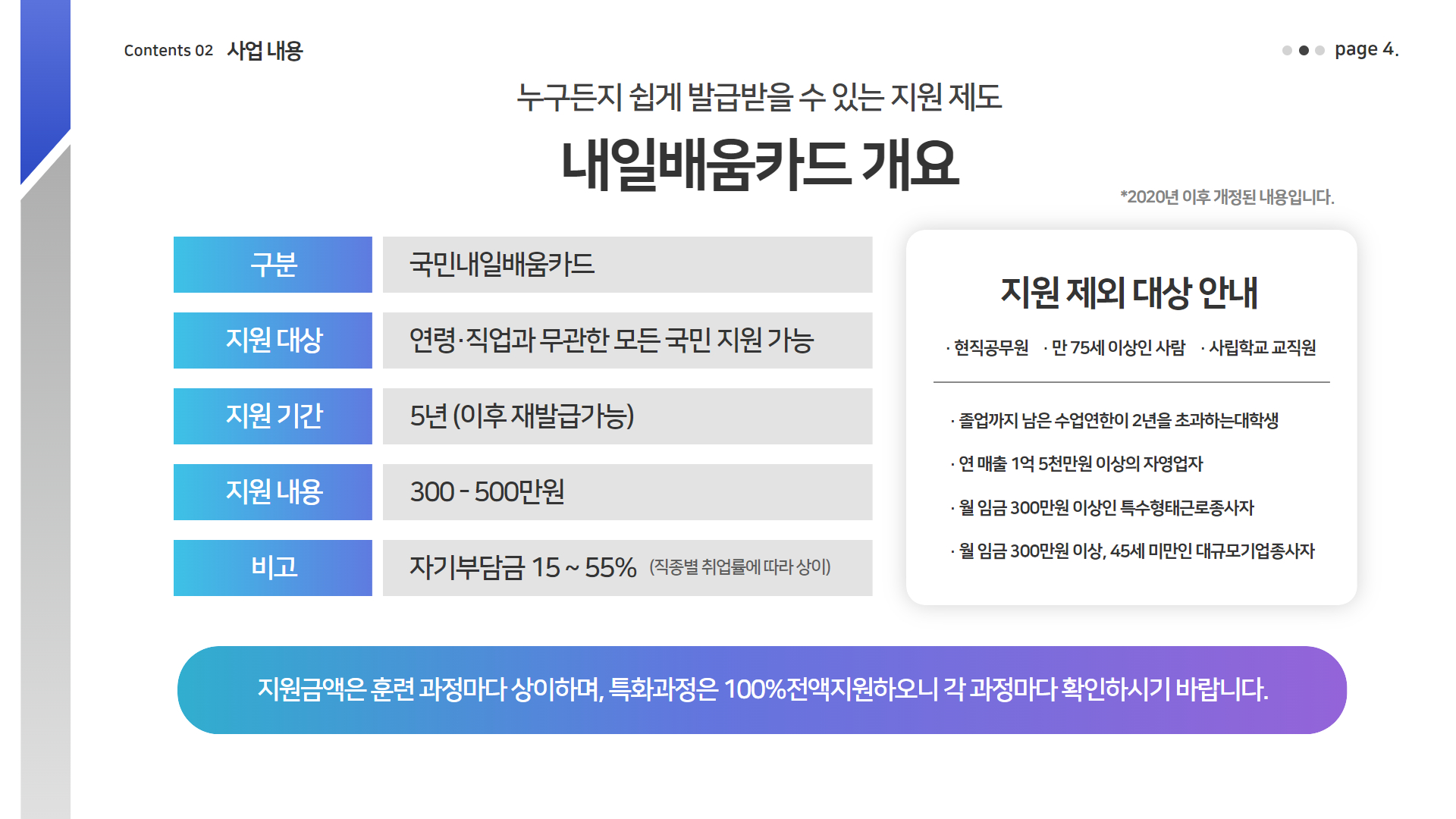 - 최소한의 자비부담으로 원하는 훈련(ex. 디자인, 식음료, 코딩, 워드 등 온, 오프라인)에 참여할 수 있습니다.