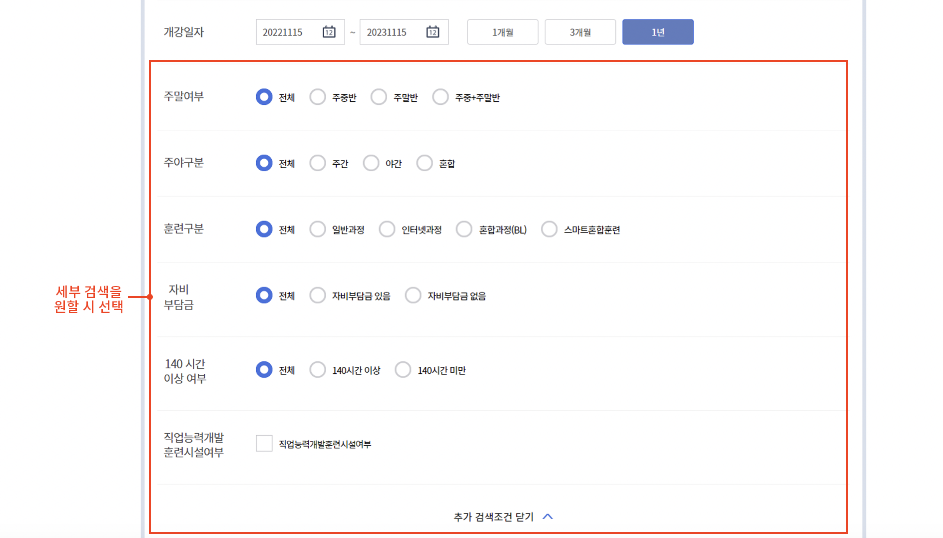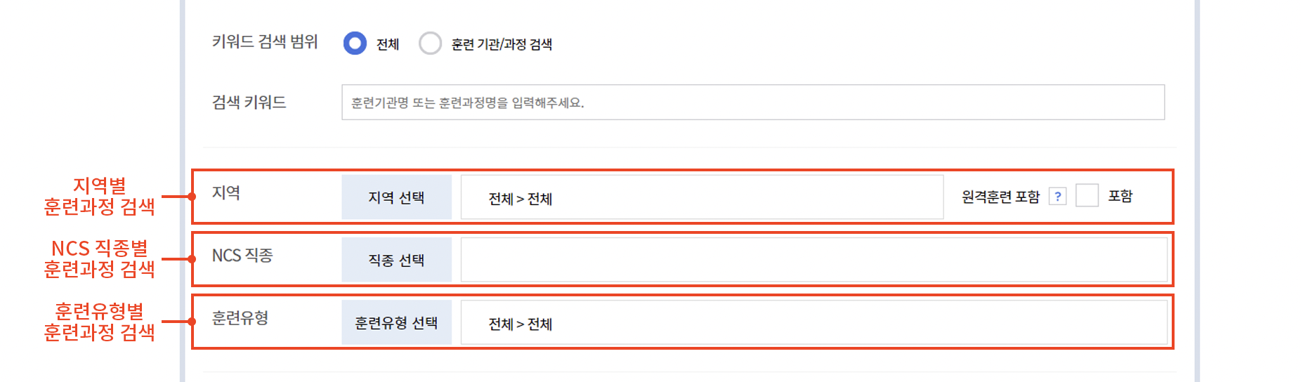 · 고용노동부에서 지원하고 있는 국민내일배움카드 훈련과정을 지역별(온, 오프라인), 훈련유형별, NCS직종별 등 다양한 항목으로 쉽고 편리하게 검색할 수 있는 기능입니다.