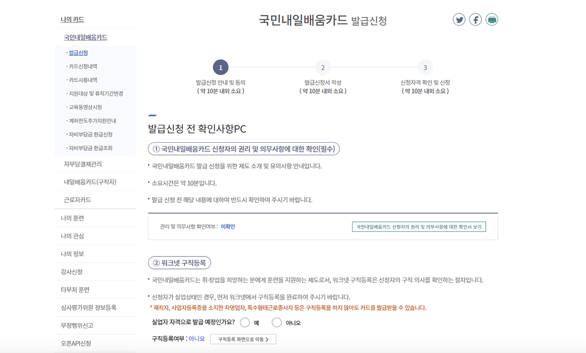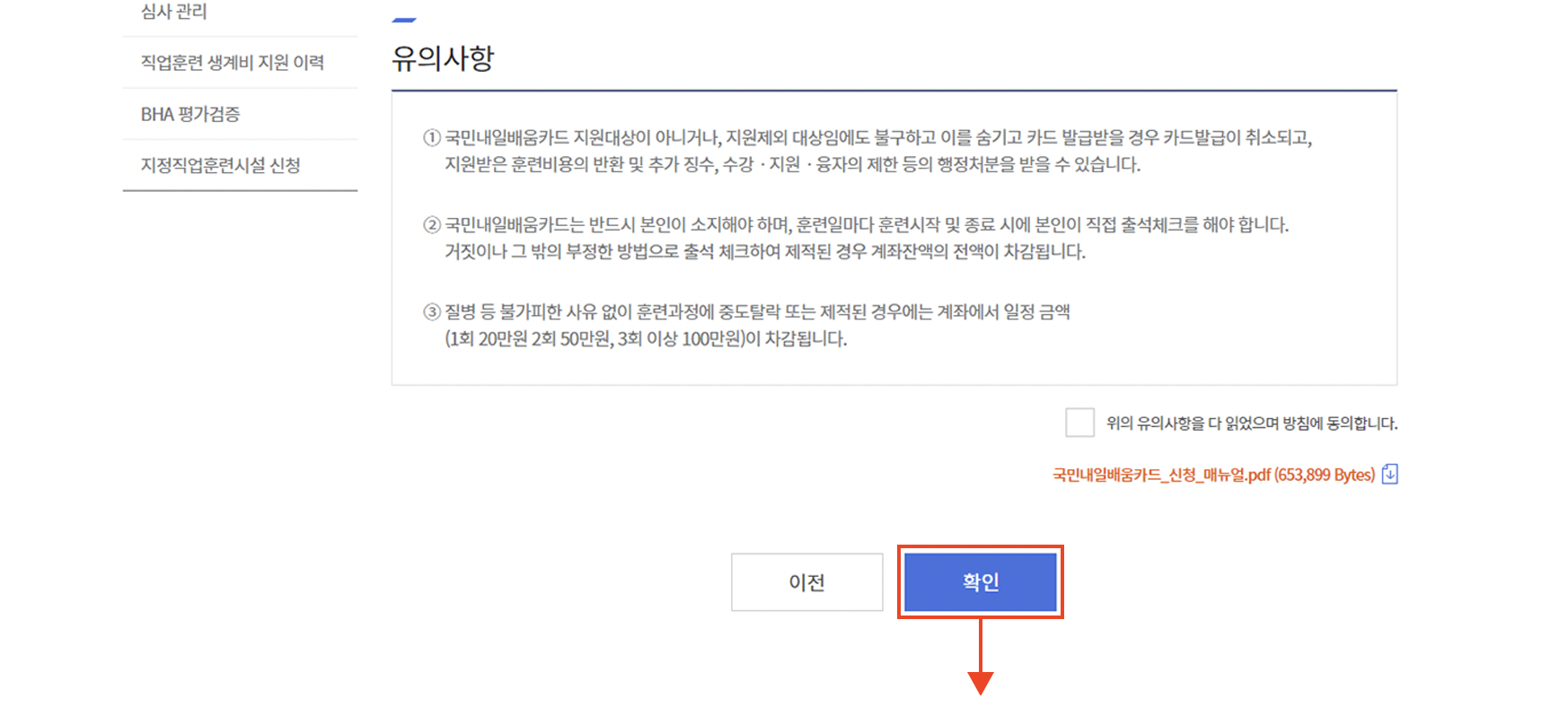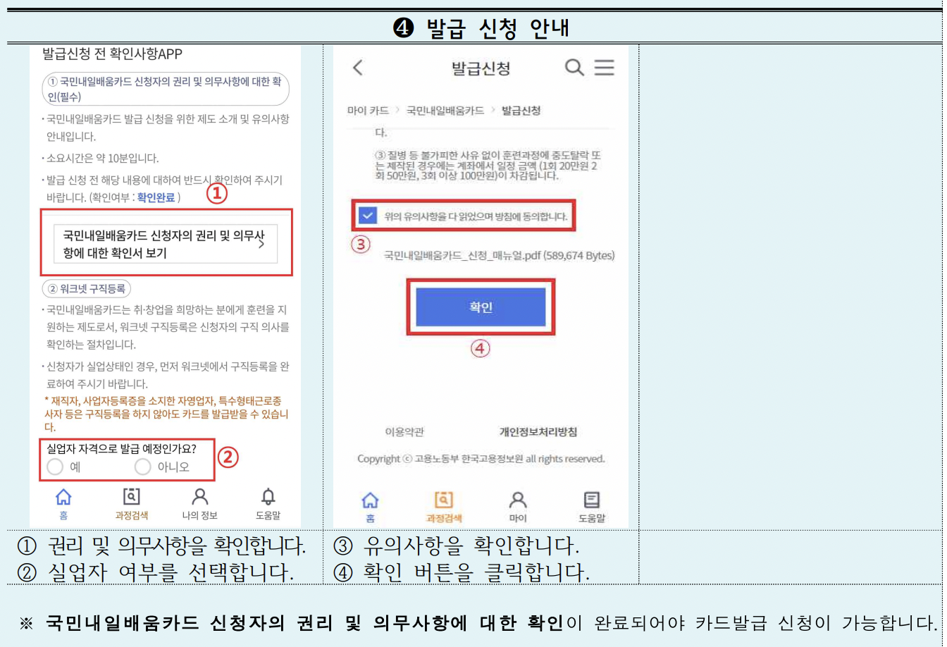 ① 국민내일배움카드 발급 전 반드시 국민내일배움카드 신청자의 권리 및 의무사항에 대한 확인서를 확인하셔야 합니다.
