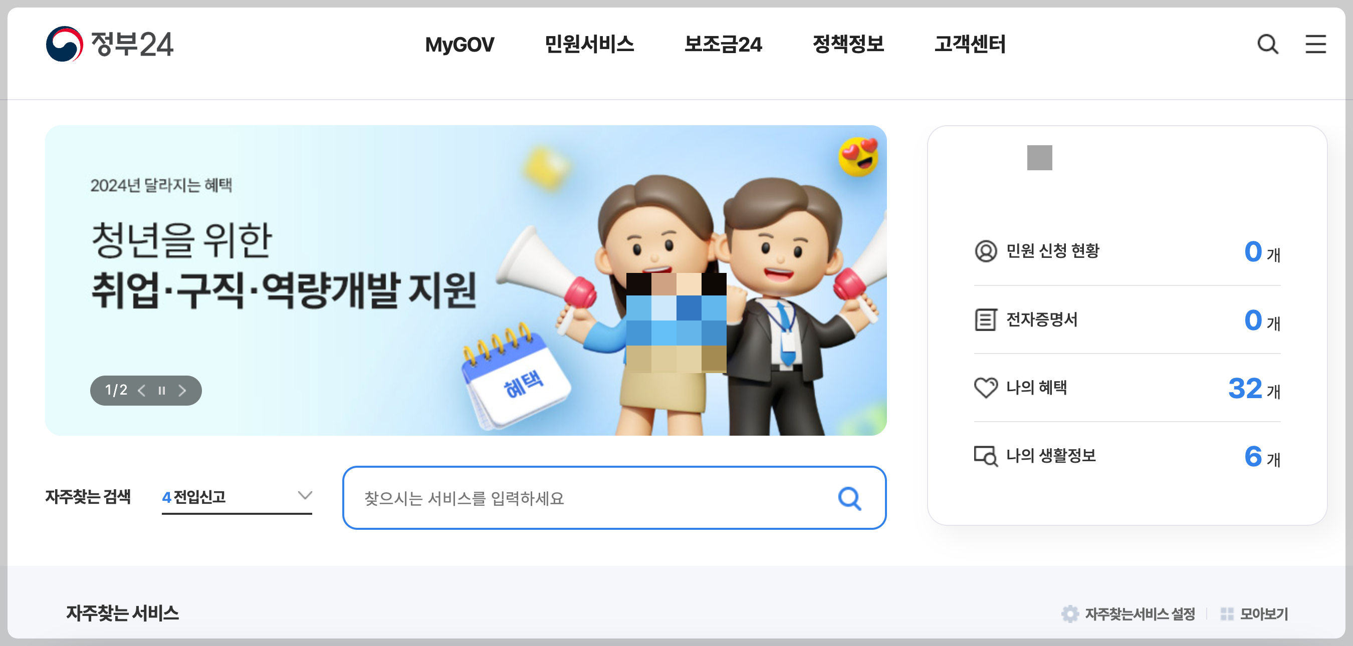 ▶ 정부24에 로그인을 하면 오른쪽 상단에 내이름과 함께 '나의 혜택'에서 [국민내일배움카드]발급대상자인지 알려준다.