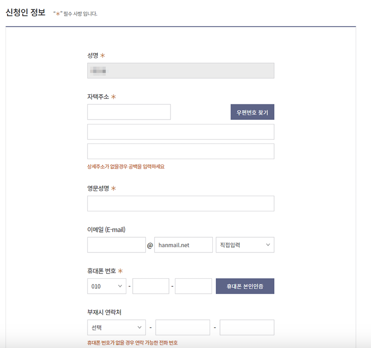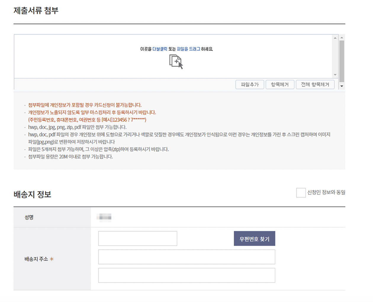 ▶ 카드 배송지 주소를 등록합니다. 신청인의 주소와 동일한 경우, ‘신청인 정보화 동일’란에 체크하시면 자동 입력됩니다.
