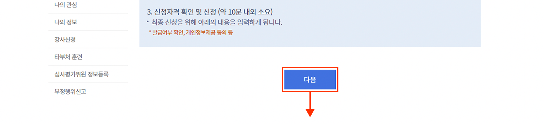 ▶ 발급 신청을 위한 정보 등록 완료 시, ‘다음’ 버튼을 클릭하면 ‘STEP 03 신청자격확인 및 신청’화면으로 이동합니다.