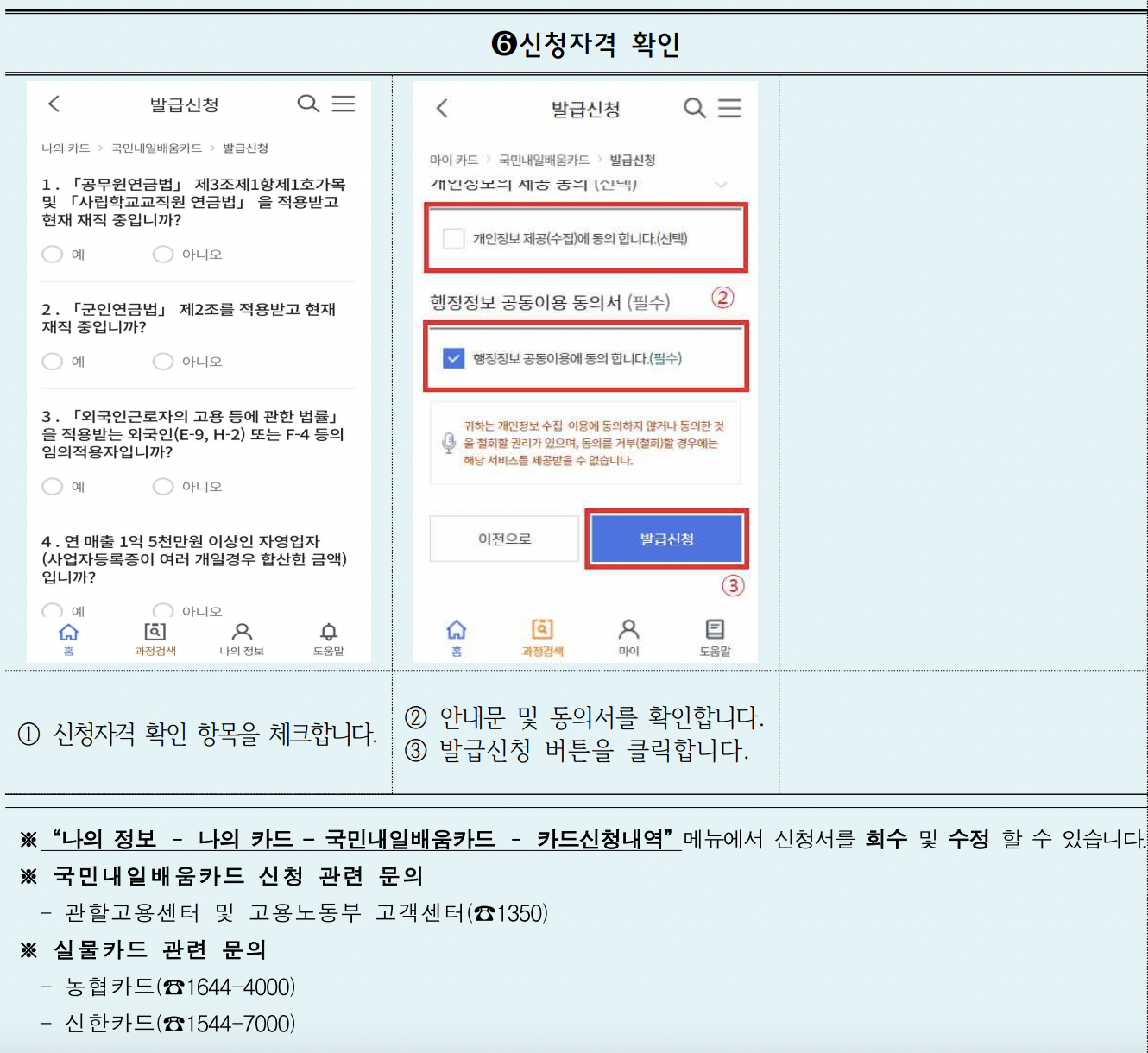 ● 전화신청 : 신청인이 선택한 제휴 카드사(NH농협카드, 신한카드)에서 TM(Tele Marketing)을 통해 본인신청 여부 확인