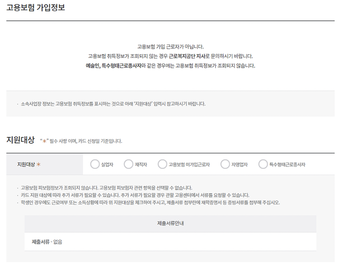 연 매출 1억 5천만원 이상의 자영업자, 월 임금 300만원 이상인 특수형태 근로종사자와 월 임금 300만원 이상 이면서 45세 미만인 대규모기업종사자 등은 발급대상에서 제외