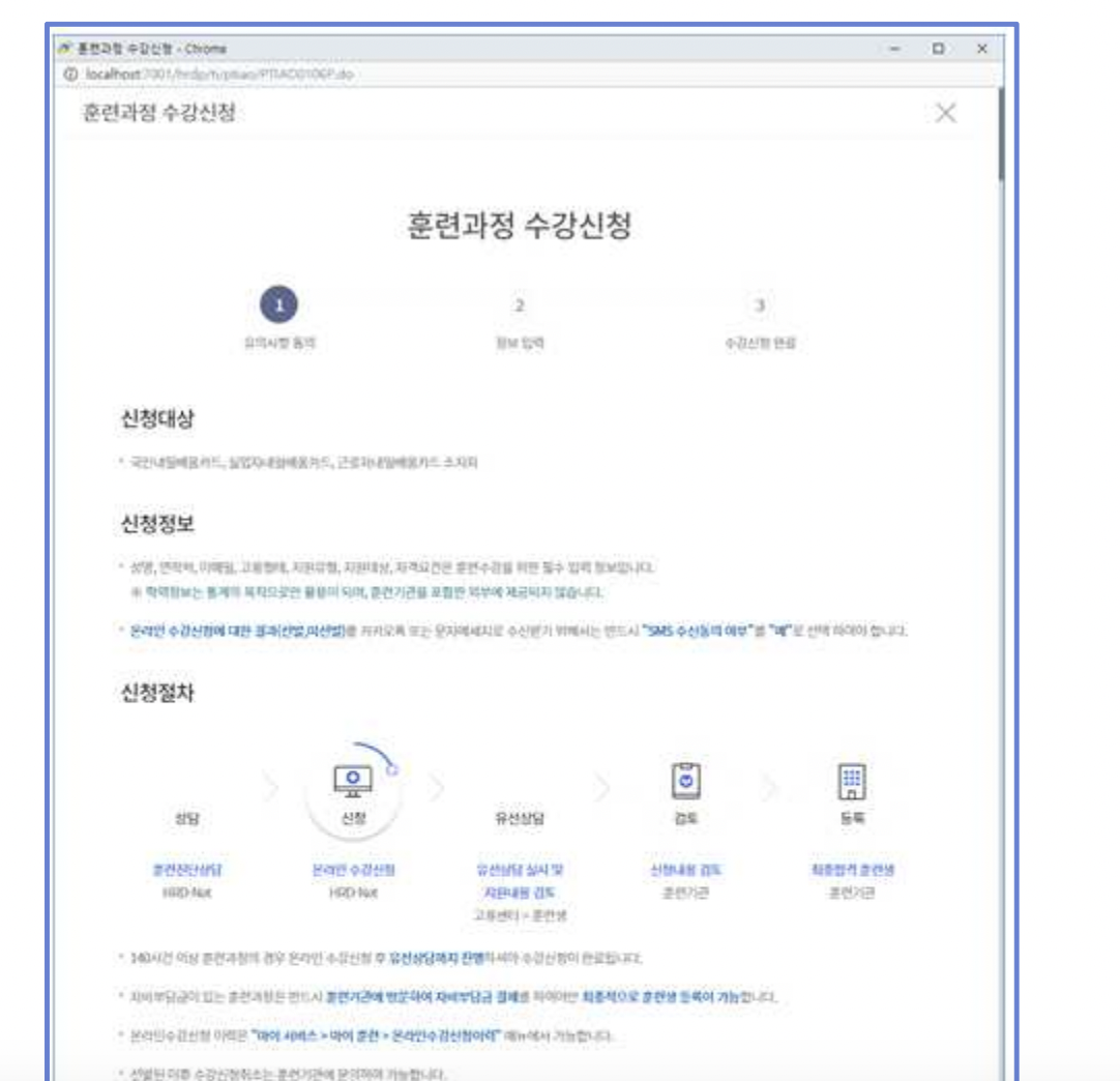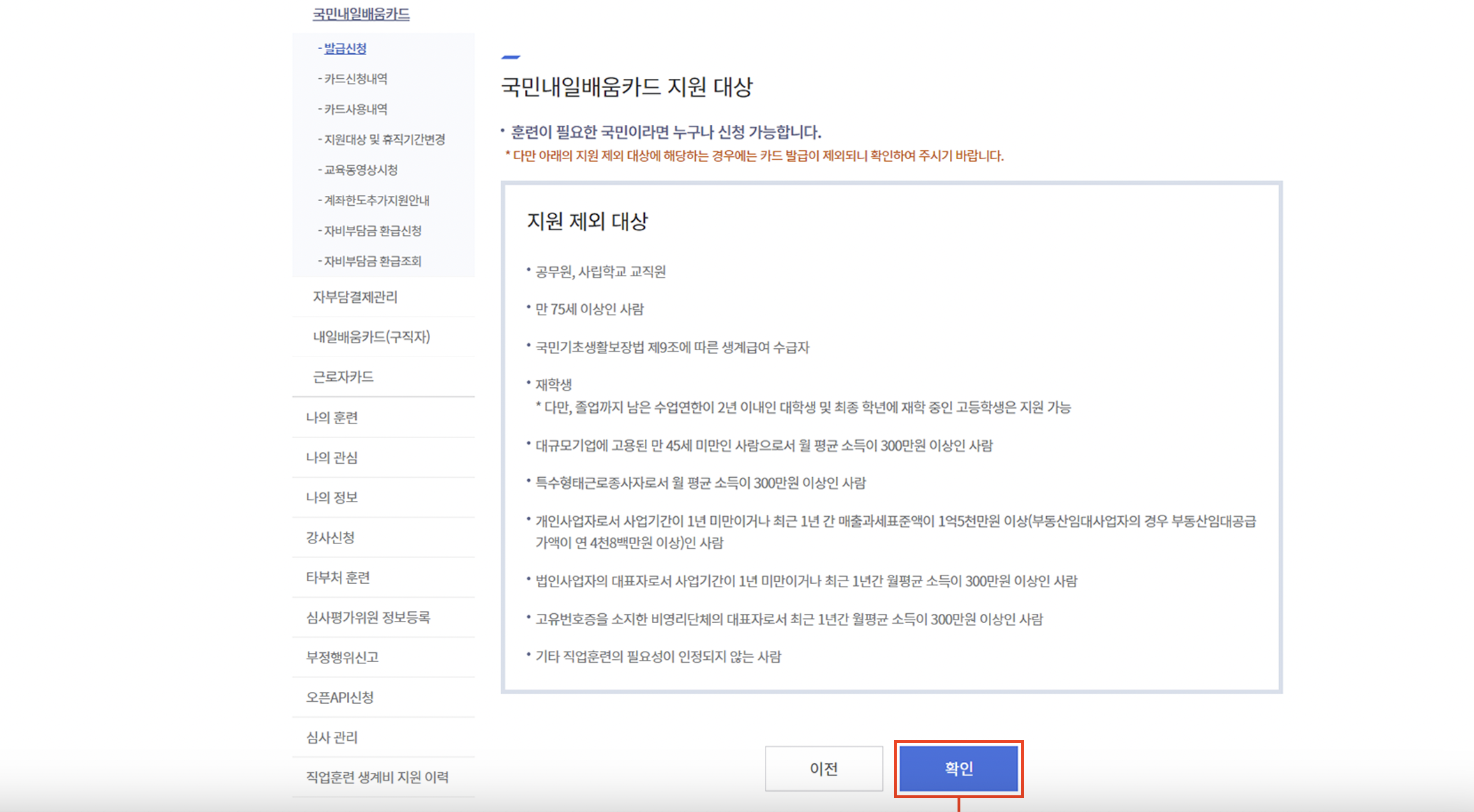 ④‘확인’ 버튼 클릭 시, 국민내일배움카드 신청화면으로 이동하게 됩니다.