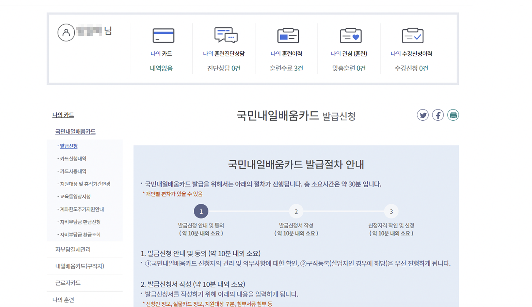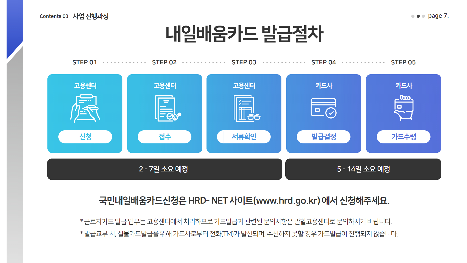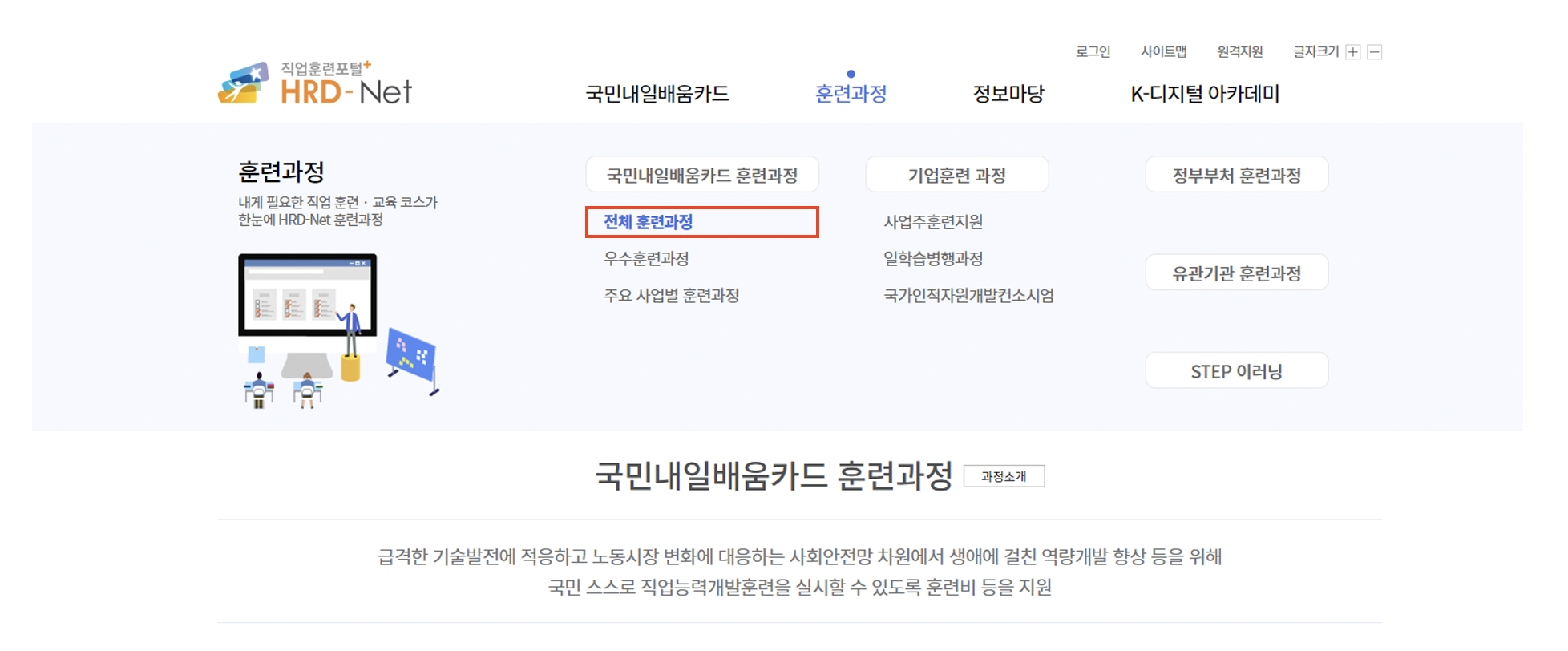 · HRD-Net 홈페이지 로그인 후 메인화면에서 국민내일배움카드 '발급 신청'으로 이동하기