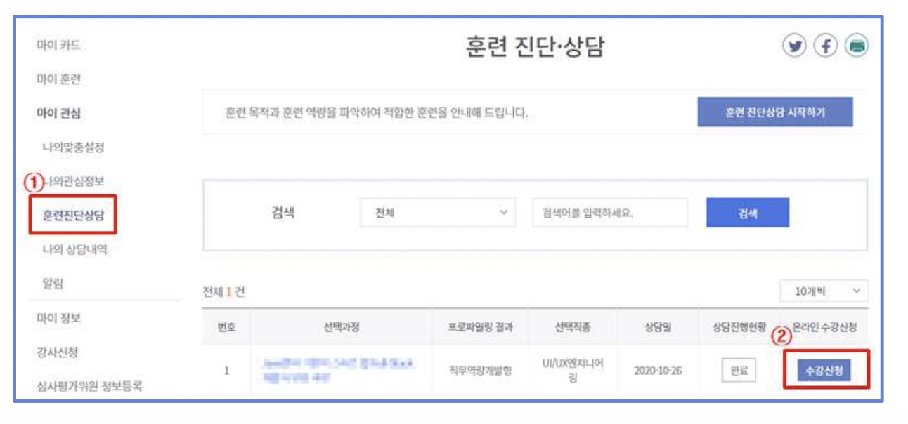 ① ‘나의 정보 > 나의 관심 > 훈련진단상담’을 통해, 메뉴에 접근합니다.