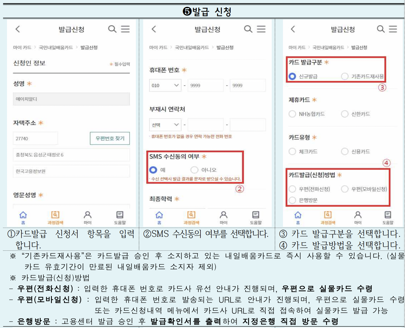 · HRD-Net 홈페이지 로그인 후, ‘홈 > 나의 정보 > 나의 카드 > 국민내일배움카드 > 발급신청’화면에서