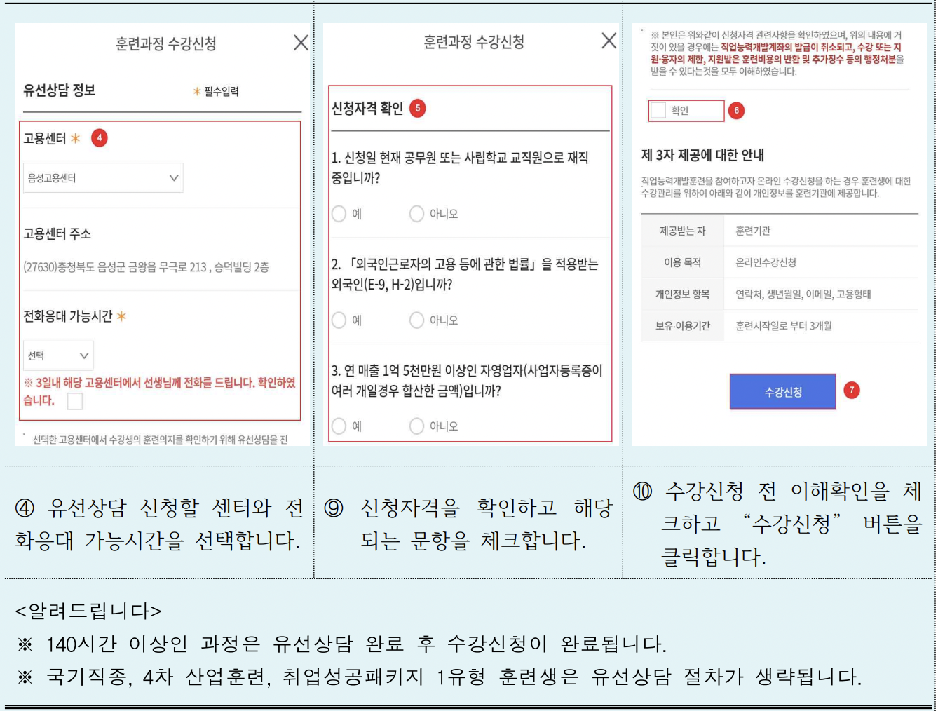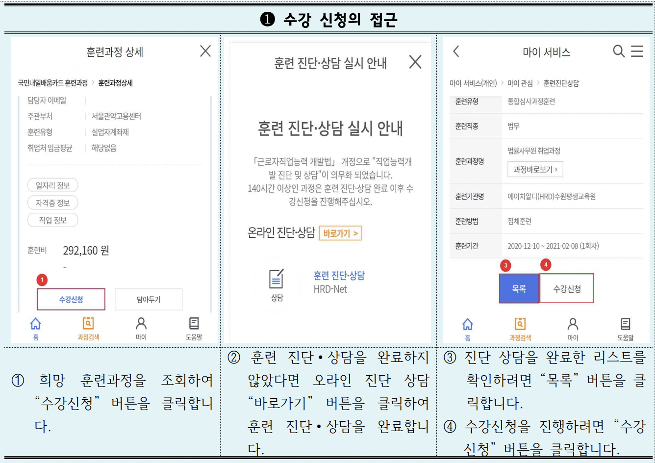 ② ‘수강신청’ 버튼을 클릭하여, 수강코자 하는 훈련과정에 대해 온라인 수강신청을 진행할 수 있습니다.