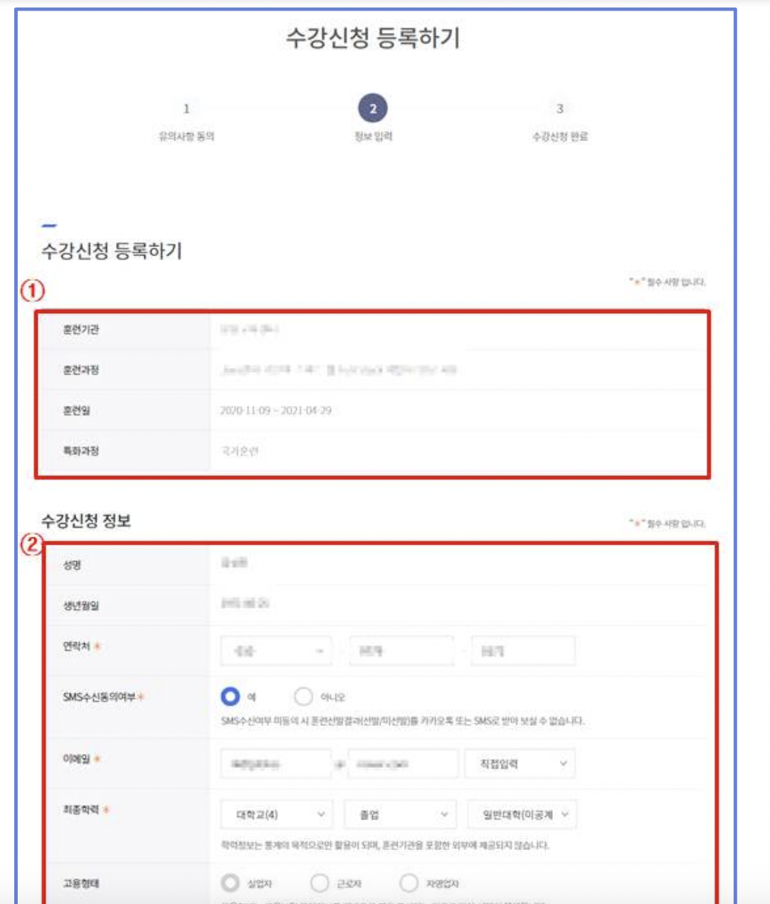 ② 국민내일배움카드 신청 정보를 바탕으로 수강 신청자의 정보가 자동으로 보입니다.