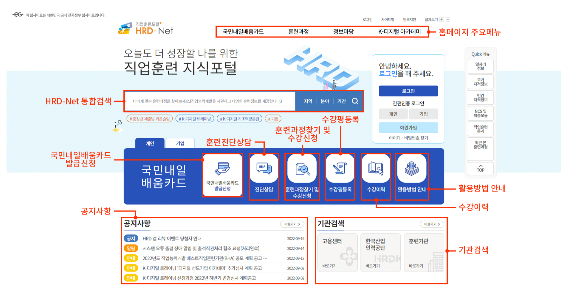 · HRD-Net 홈페이지 회원 로그인 유형 : 개인회원, 기업회원, 훈련기관회원, 유관기관, 대리인(기업/훈련기관)