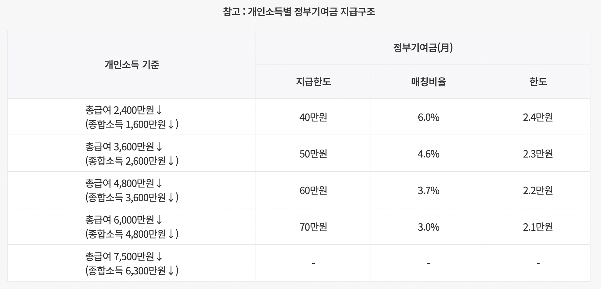 - 납입한 금액에 비례해 소득구간별 정부기여금 지원
