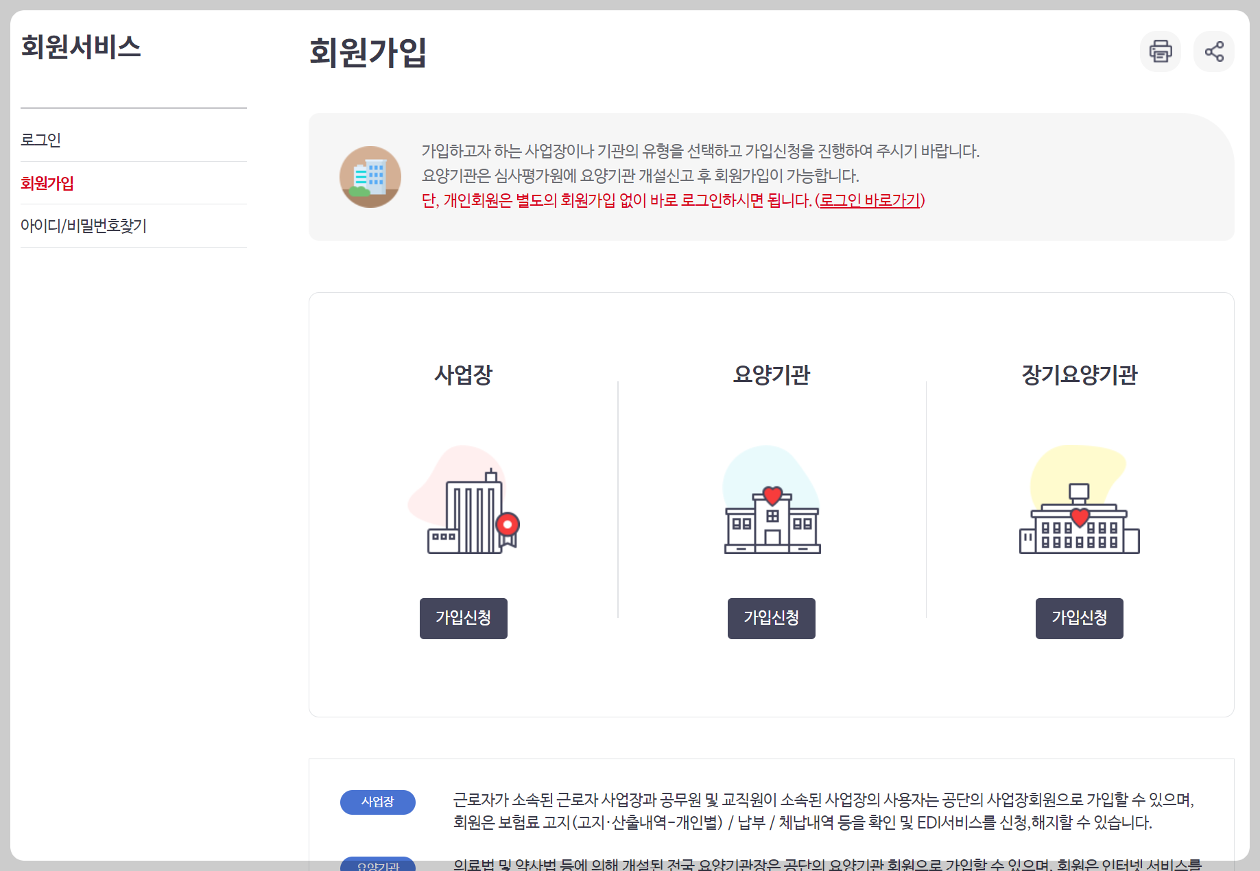 사업장, 요양기관, 장기요양기관이 있는데, 이곳에서 해당되시는 곳을 선택후 가입신청하시면 됩니다