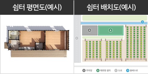 2. 면적 : 쉼터의 연면적은 33㎡(약 10평) 이내로 제한되어 있습니다
