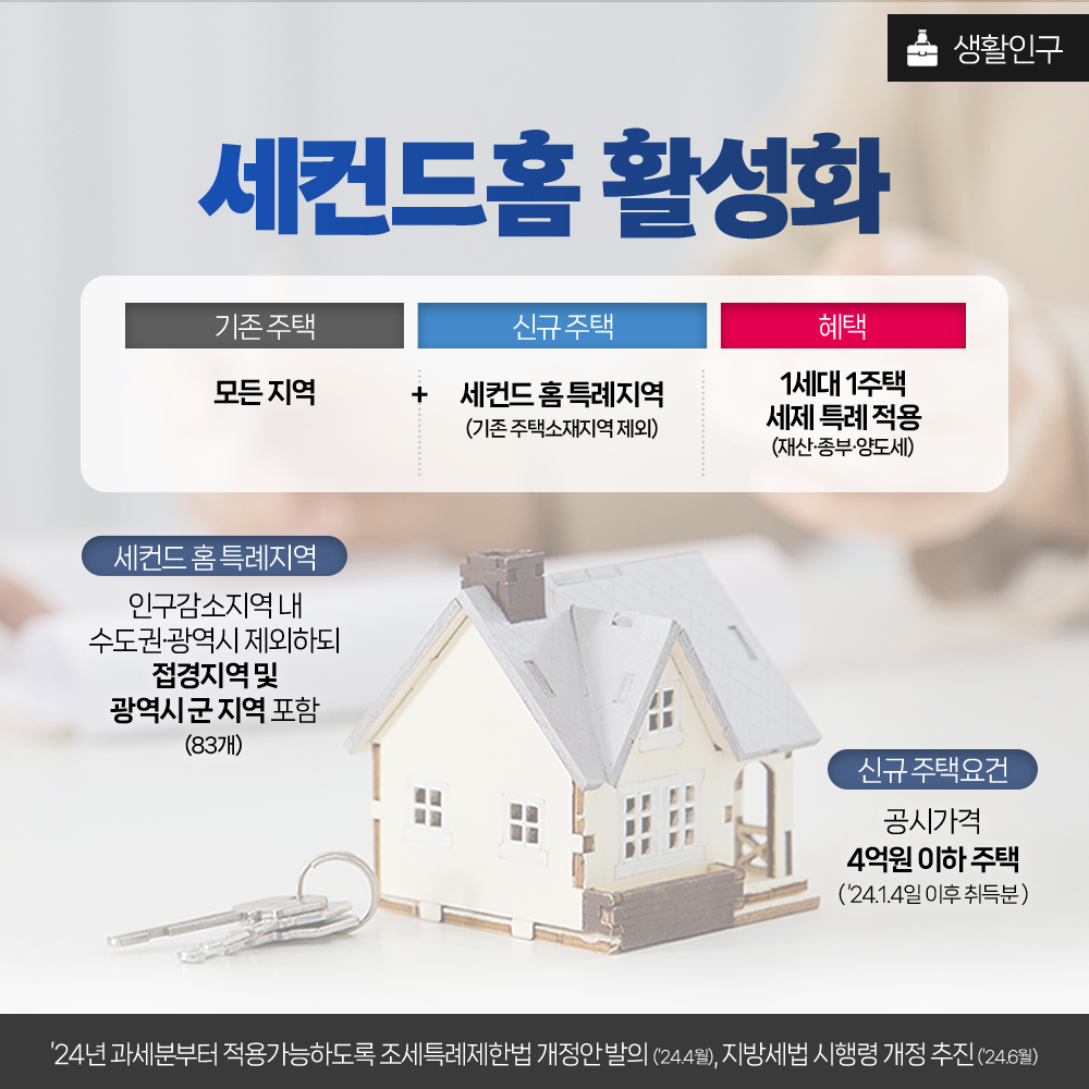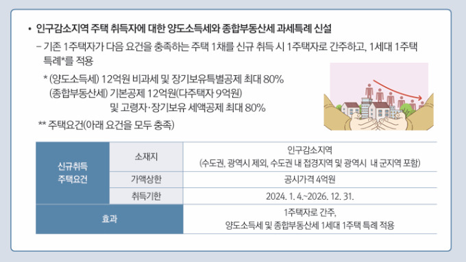 기존 1주택자가 인구감소 지역의 신규주택(공시가격 4억원 이하)을 취득해도 1주택자로 간주합니다.
