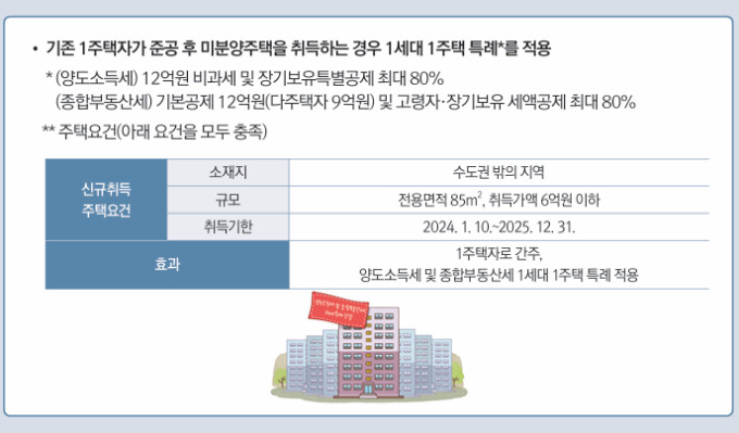 비수도권 소재 준공 후 미분양 주택에 대한 양도세와 종부세 과세특례도 새로 생긴다.