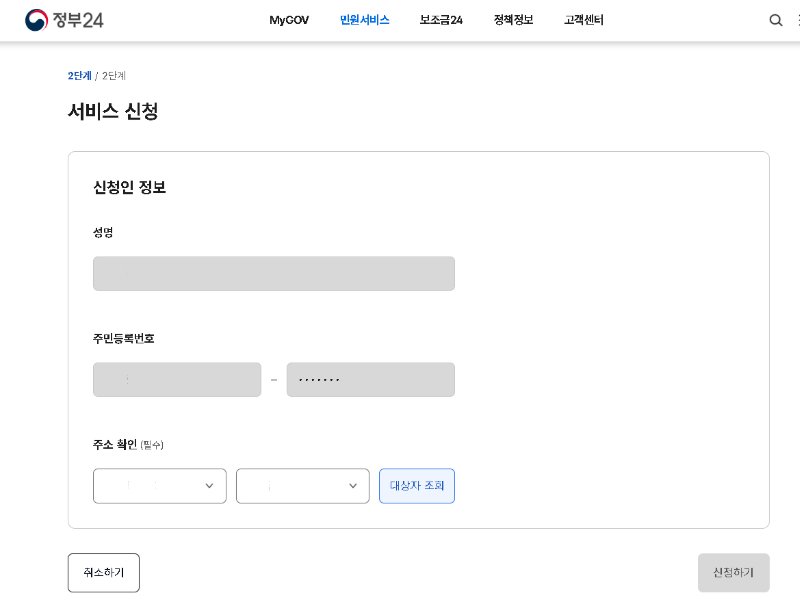 성명, 주민등록번호, 주소확인까지 입력하시고 '대상자 조회' 버튼을 클릭합니다.