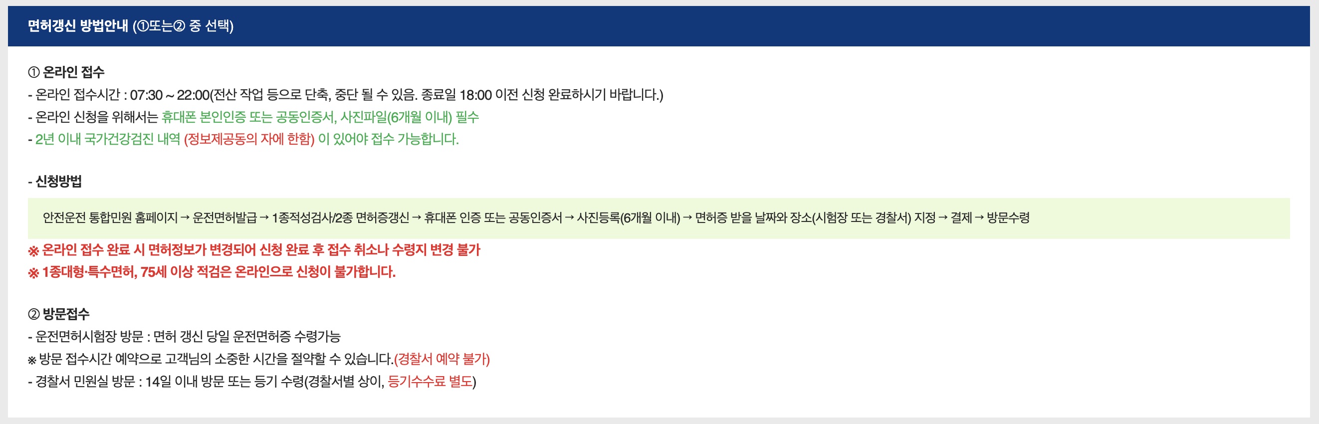 - 면허증 수령은 직접 방문 필요: 온라인으로 신청하더라도 새로운 면허증은 직접 수령해야 함