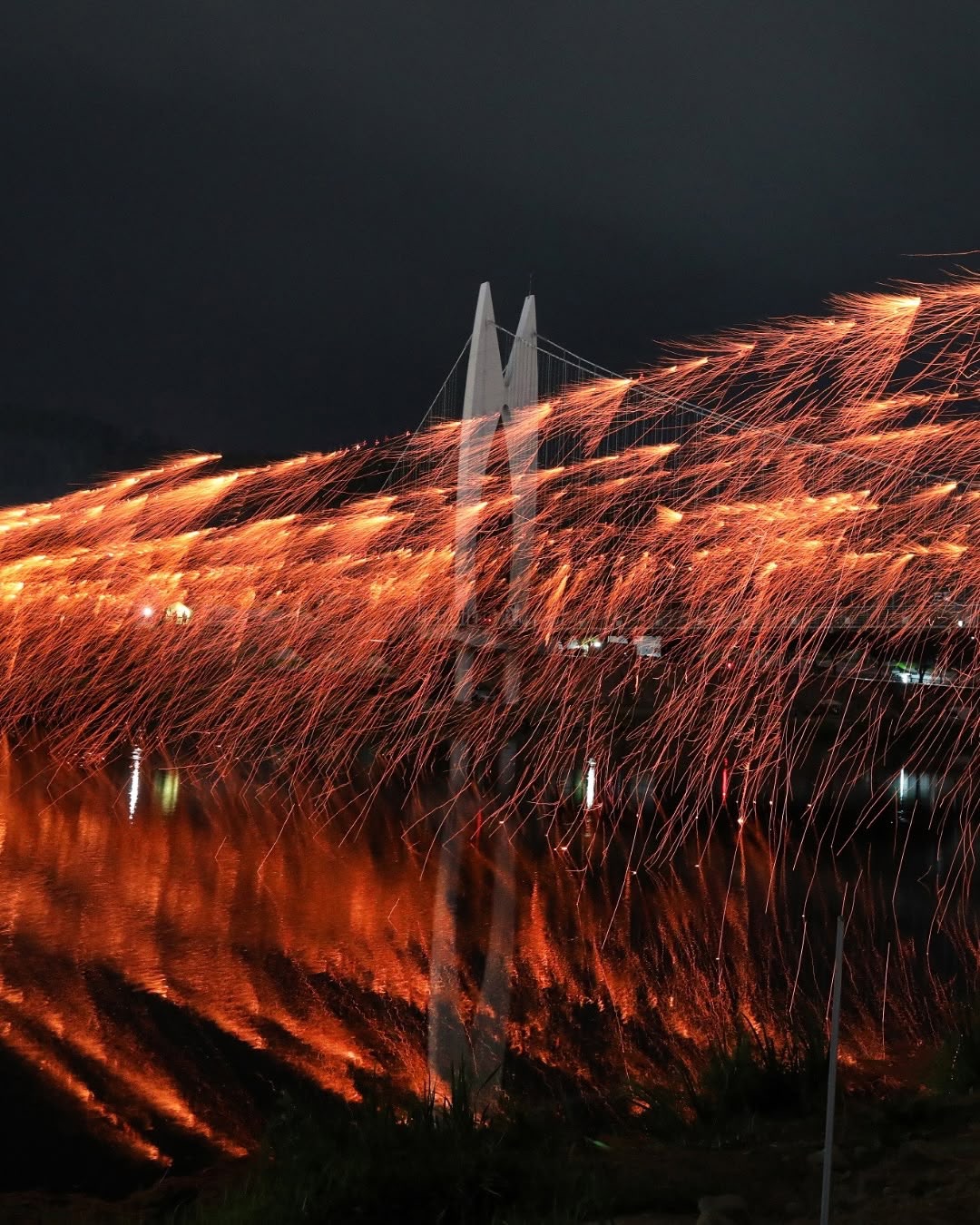 전통 불꽃놀이로, 여러 가닥의 줄에서 불꽃이 쏟아져 내리듯 흩날리는 불빛이 밤하늘에 장관을 이루는 공연이에요. 현대적인 불꽃놀이·레이저쇼와 만나 더욱 환상적인 무대를 완성합니다!