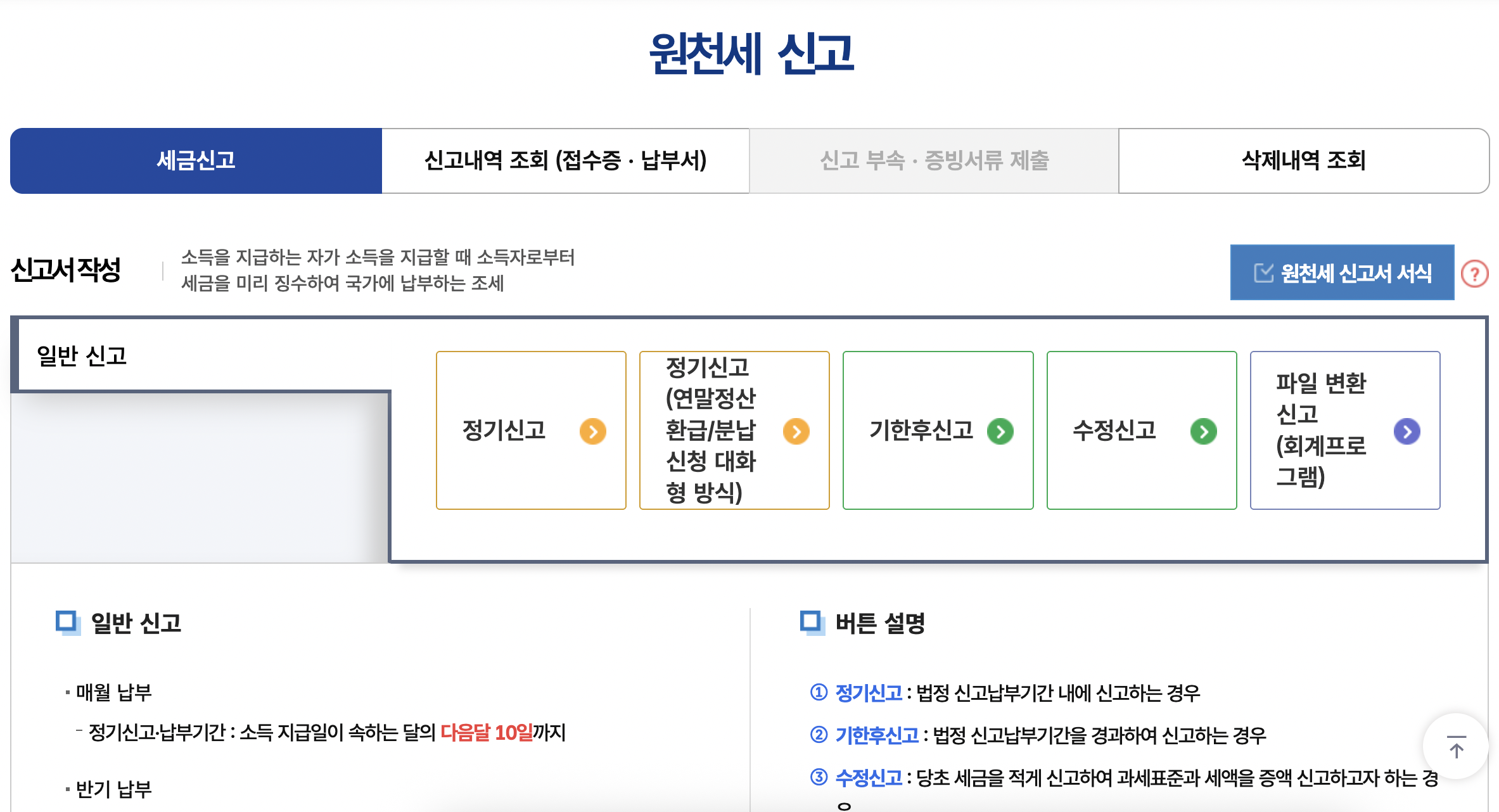 *세금신고에서 좌측에 위치한 원천세 신고를 클릭하면 오른쪽에 일반신고