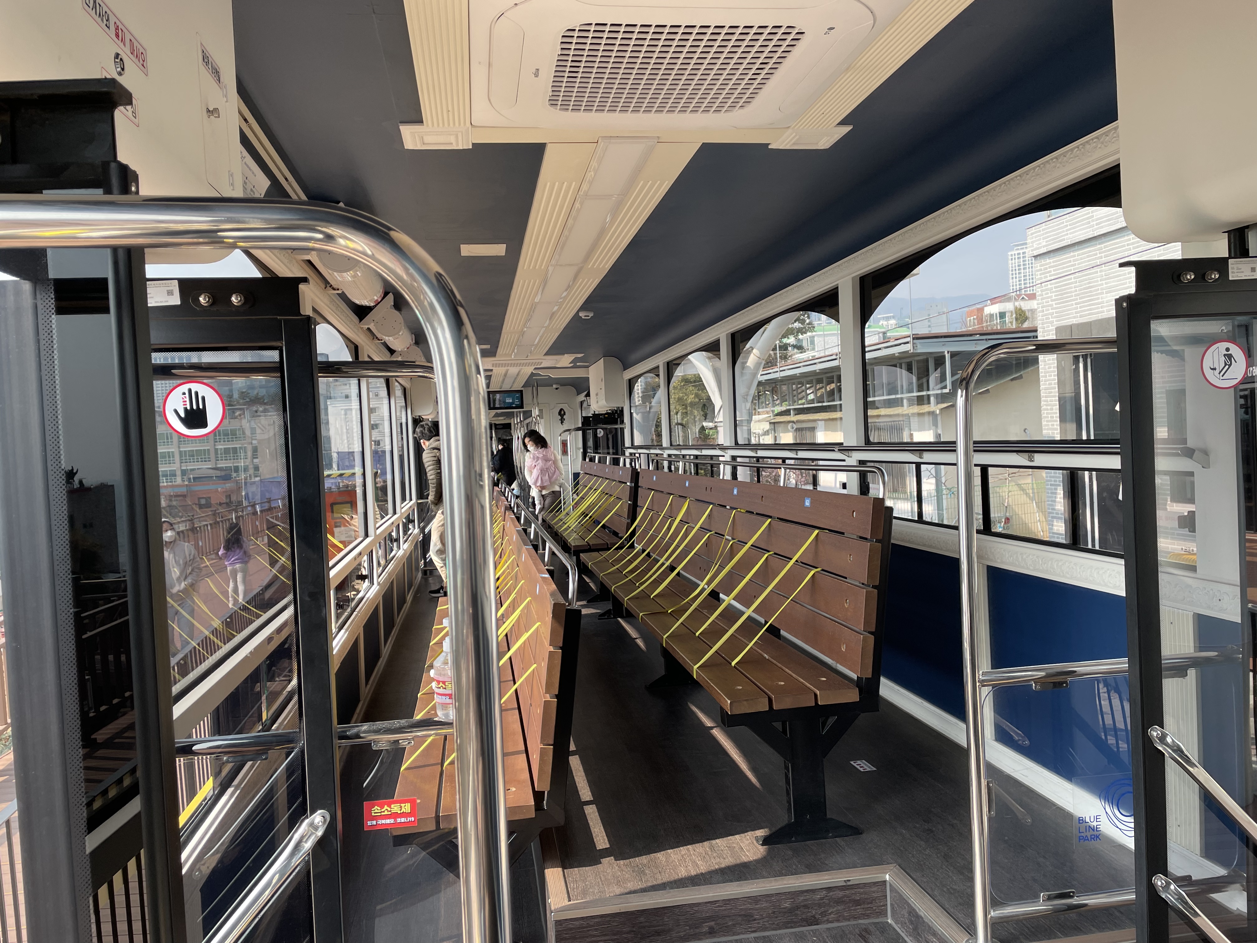 해변열차는 바다를 바라볼 수 있게 좌석을 바다쪽으로 위치시켰어요~