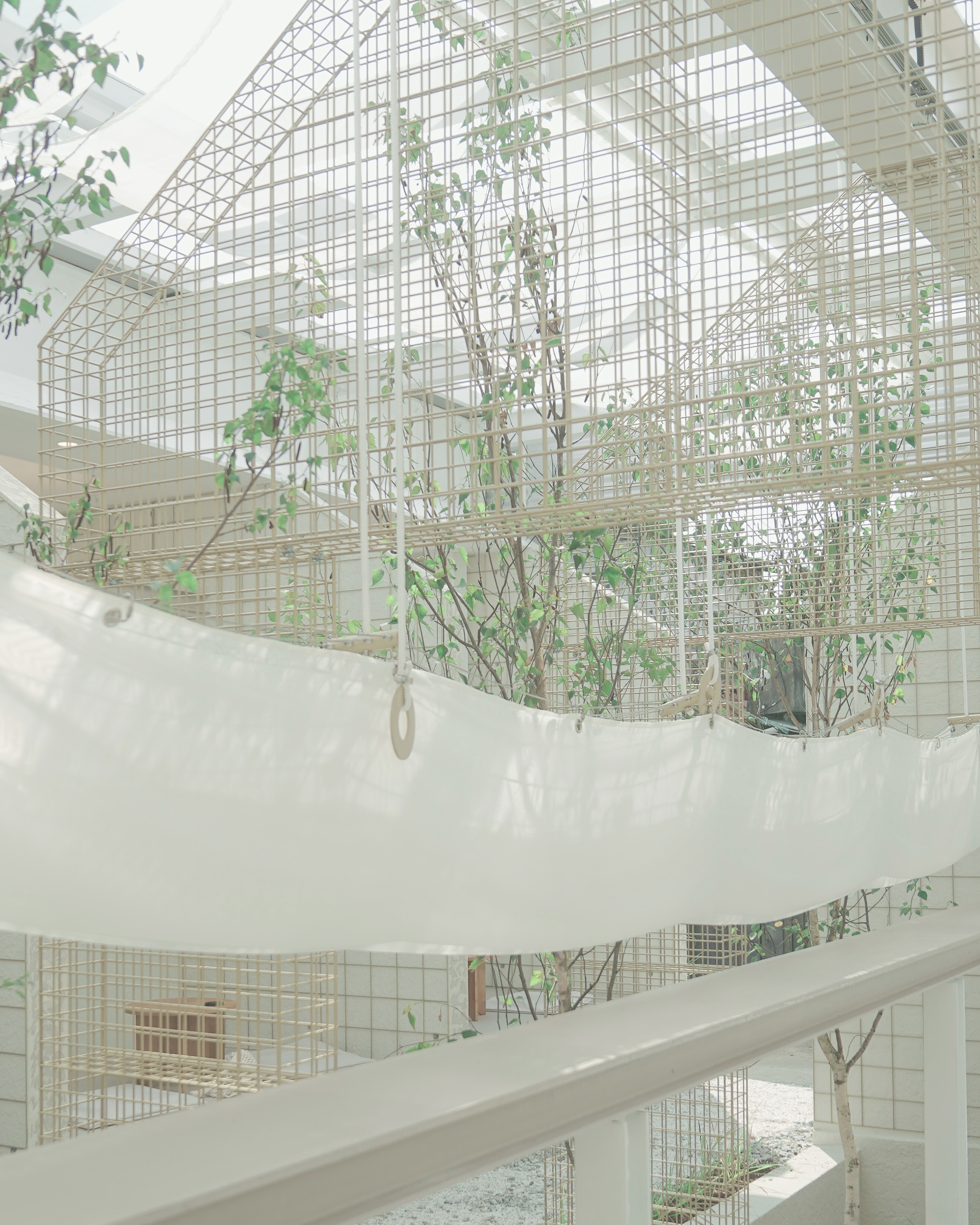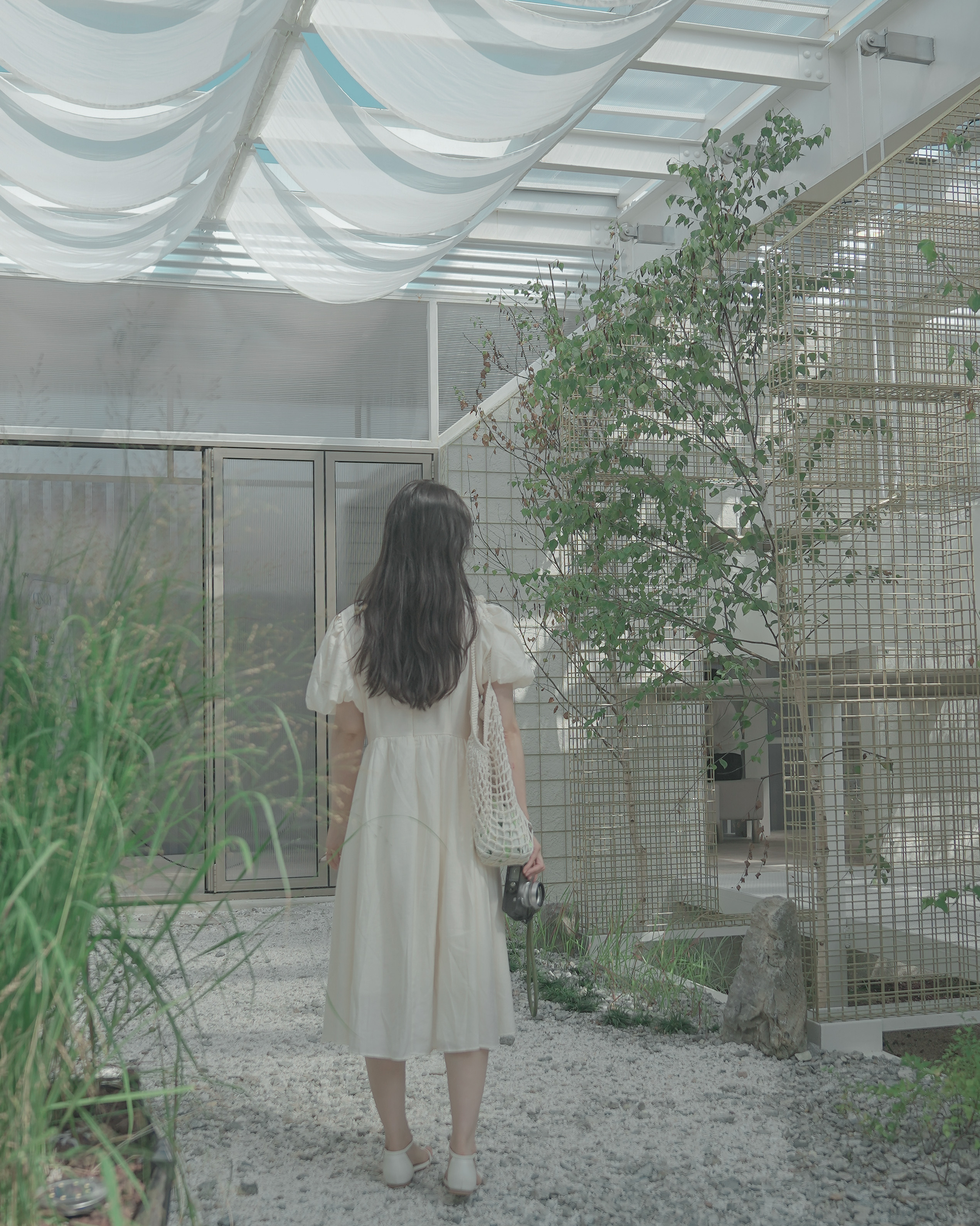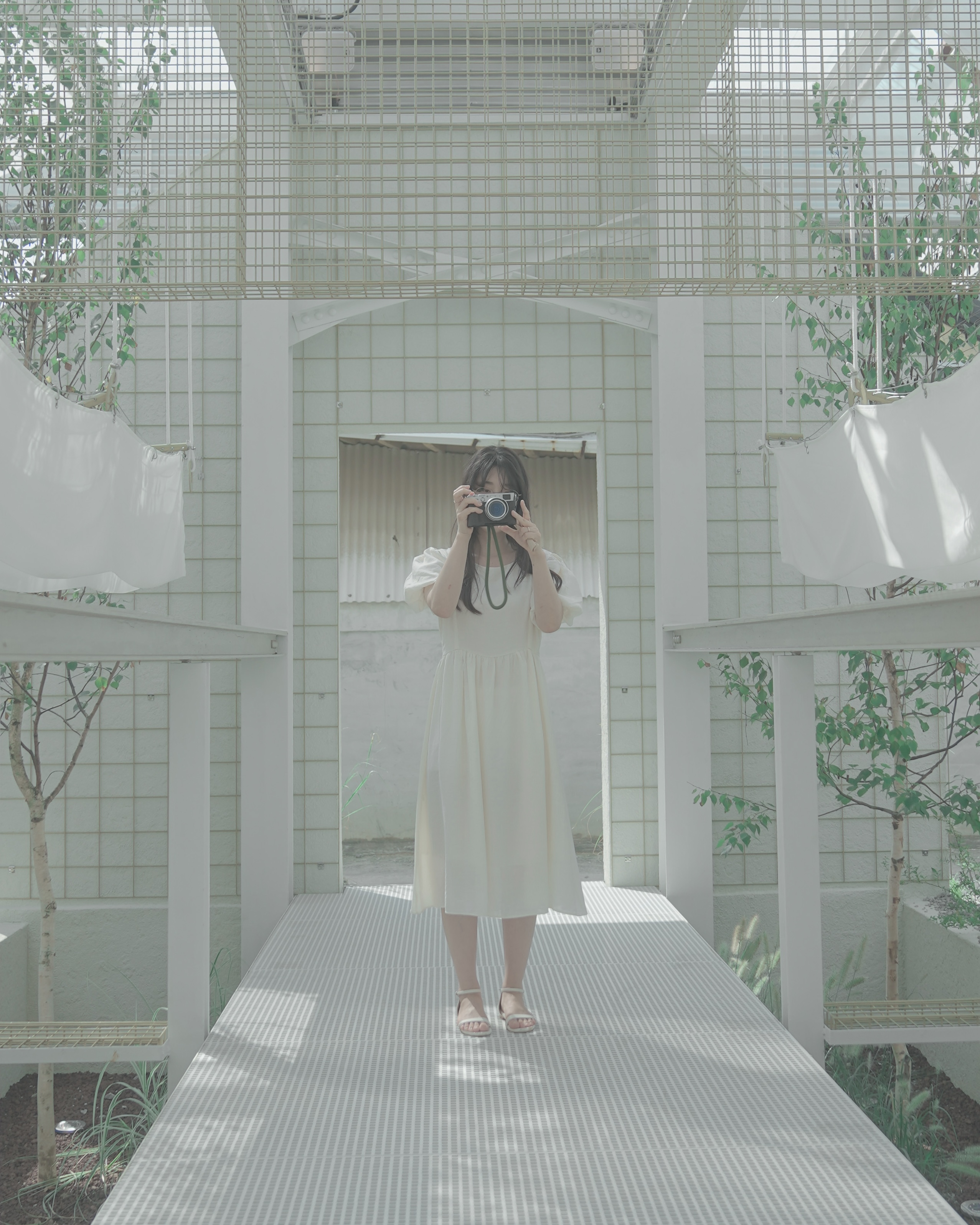 하얀색의 벽들과 중간 중간 심어진 초록나무가
