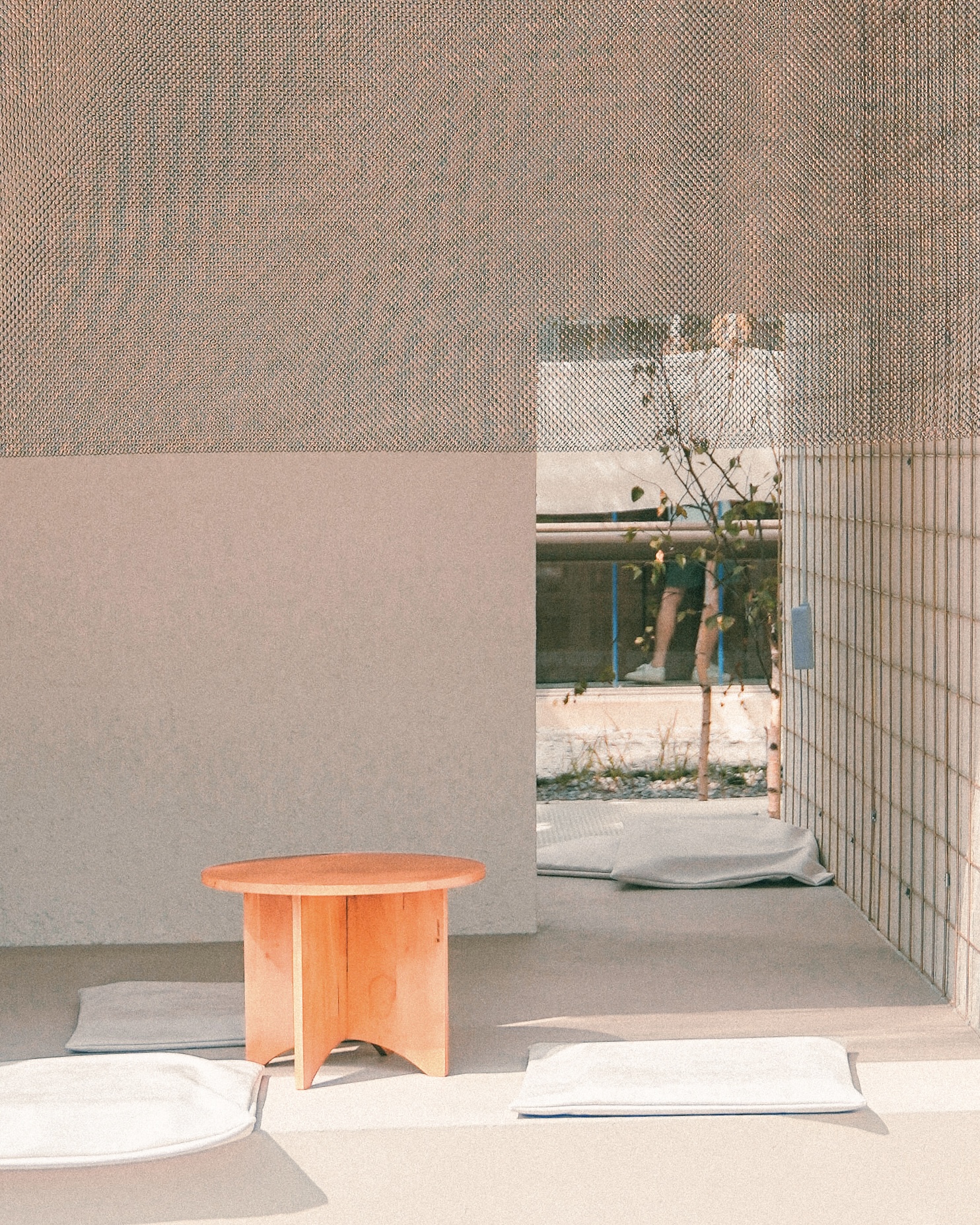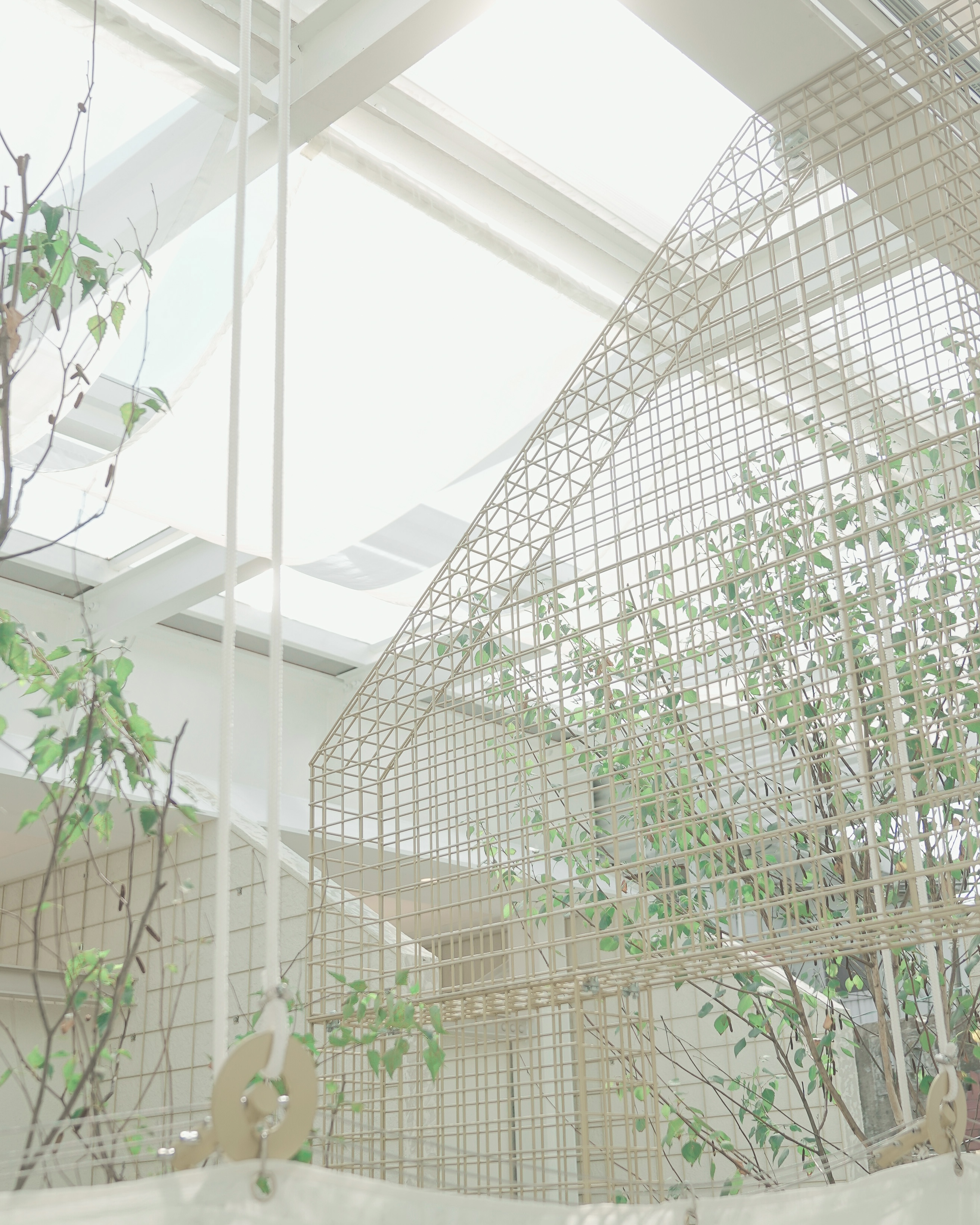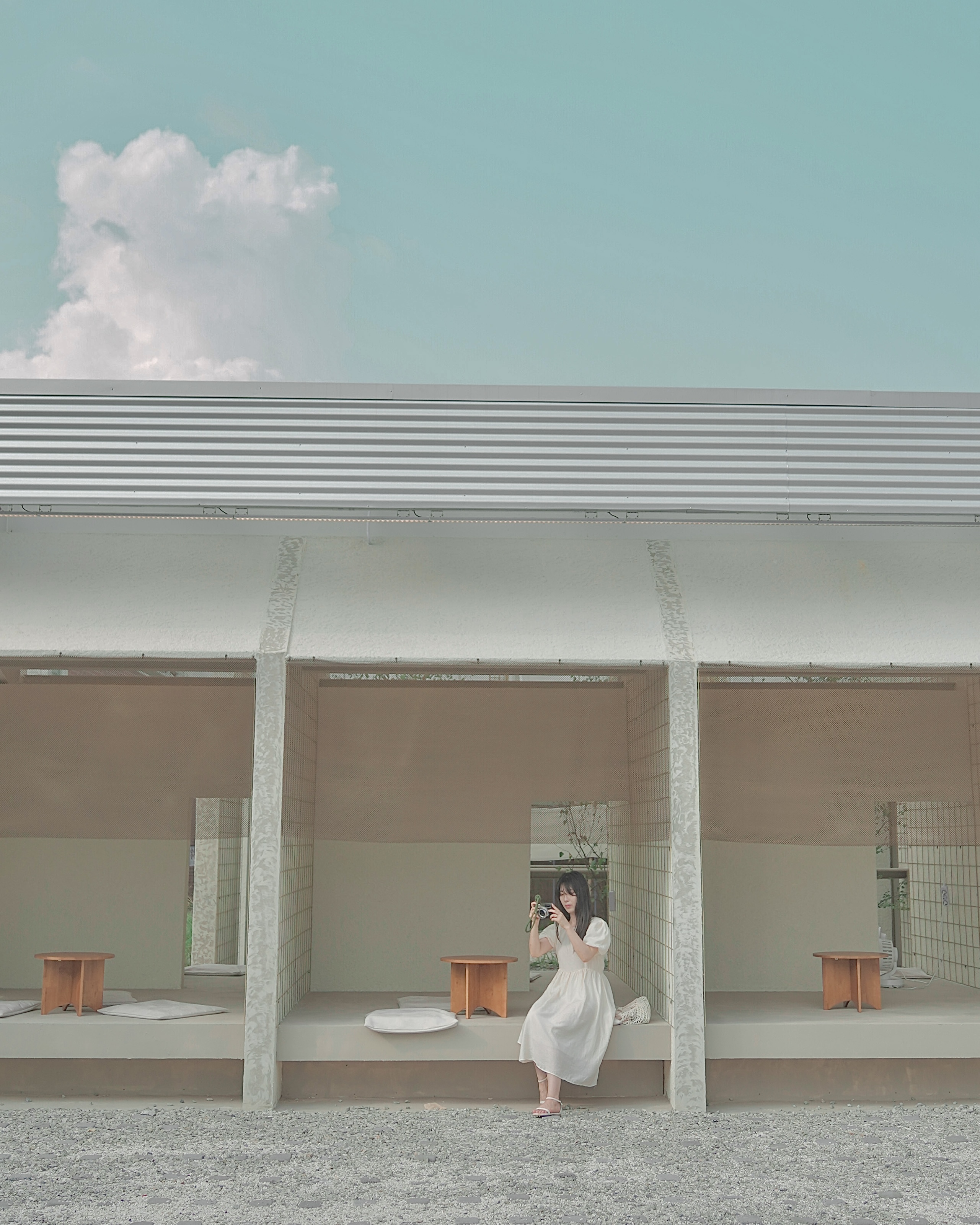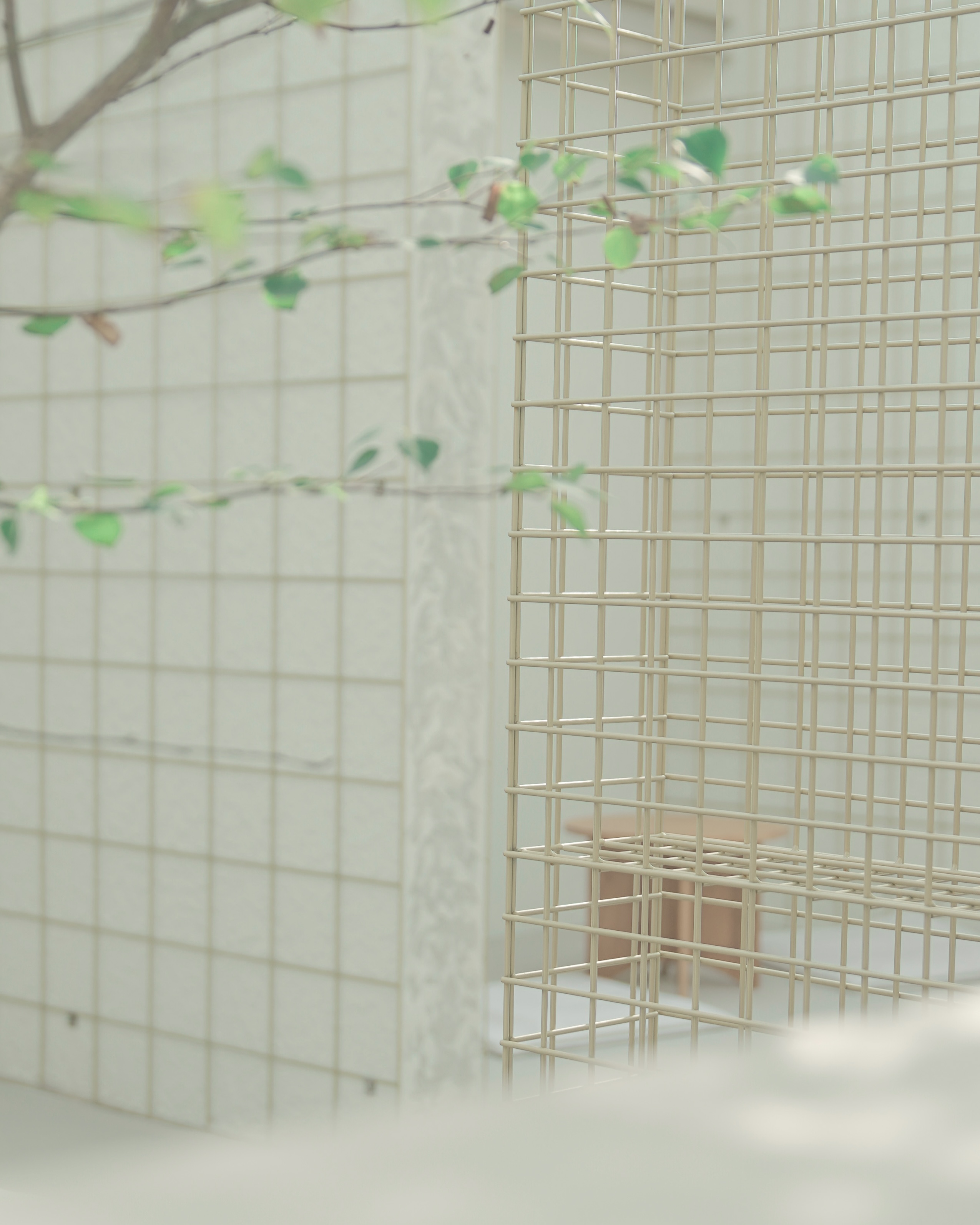하얀색의 벽들과 중간 중간 심어진 초록나무가