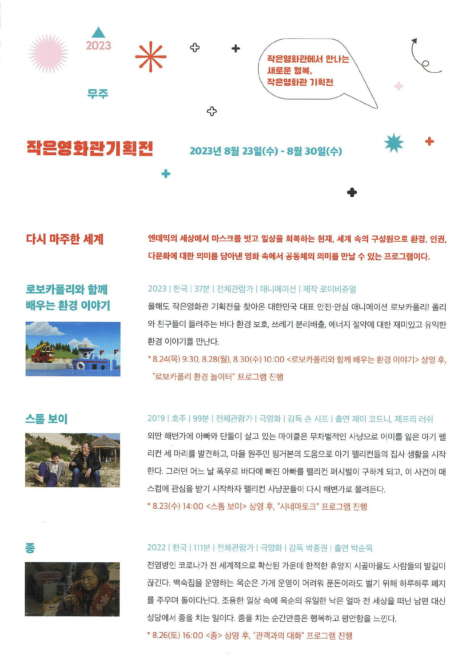 올해에도 문체부와 영화진흥위원회가 주최하는 <작은영화관 기획전>이 무주산골영화관에서 2023년 8월 23일(수)부터 8월 30일(수)까지 8일간 무료로 진행된다. 매년 4~5월 즈음에 전국의 작은영화관을 대상으로 기획전 프로그램 공모가 진행되는데, 올해에도 다행히 무주산골영화관이 선정되었다.